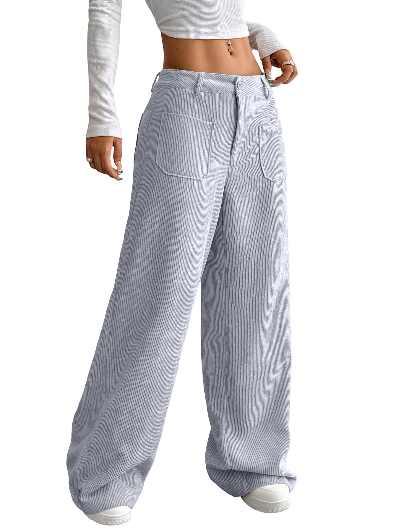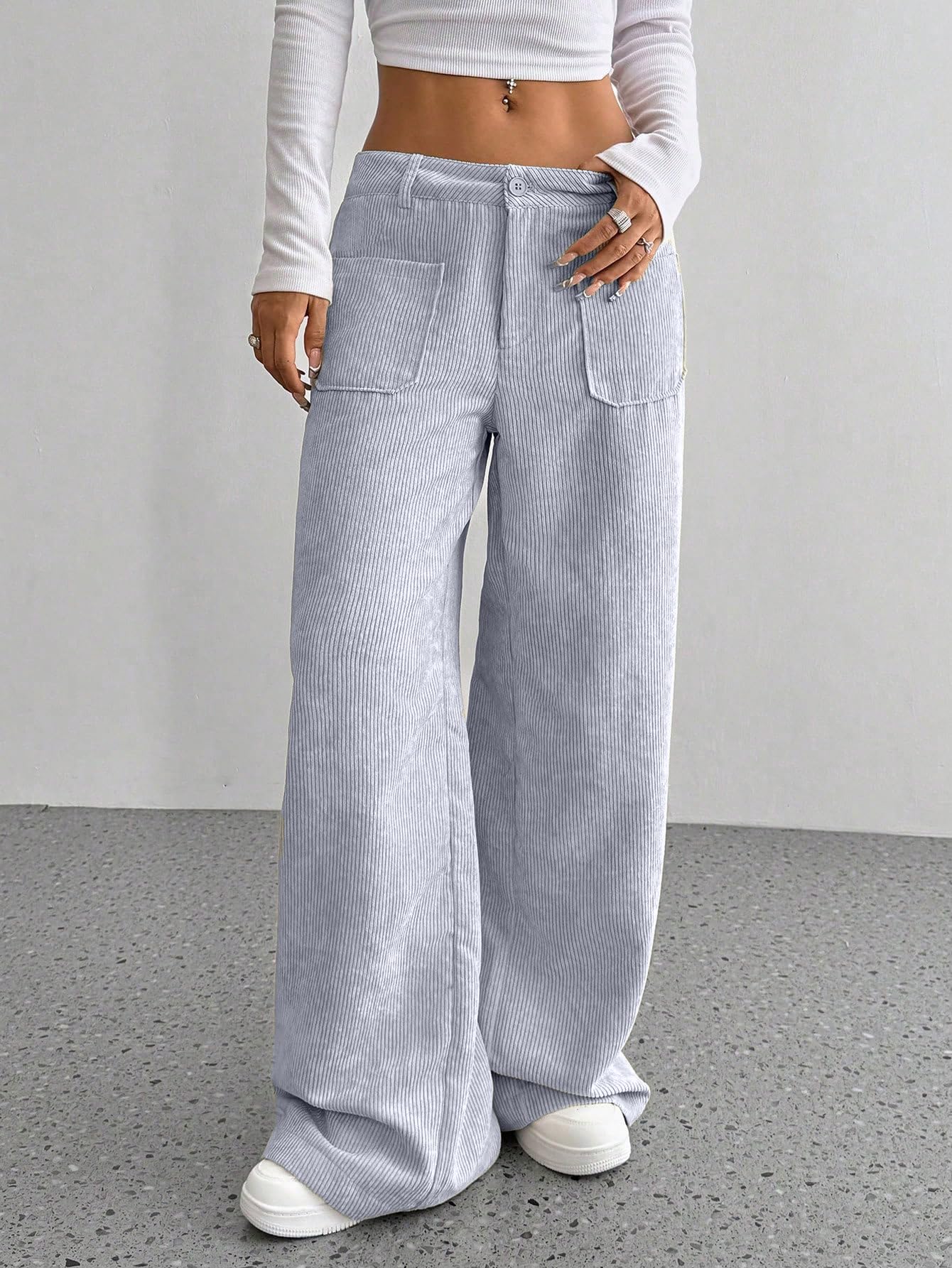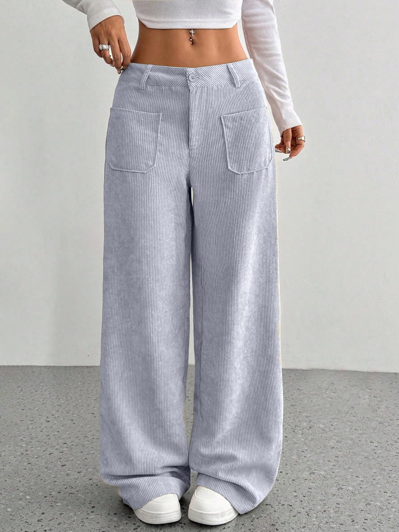 Discover a perfect blend of style and comfort with SAKHWALA Women’s Corduroy Wide Leg Trousers. Tailored from premium corduroy fabric, these pants offer a luxuriously soft feel with a classic ribbed texture that adds both warmth and character—making them a great choice for fall and winter wardrobes. Designed with a comfortable high-rise waist and relaxed wide-leg fit, these trousers ensure a flattering shape while allowing unrestricted movement. The functional front patch pockets not only elevate the overall aesthetic but also offer practical storage for your essentials. Whether you're stepping out for a casual brunch, a day at the university, or lounging in style, these trousers pair effortlessly with crop tops, fitted blouses, or oversized layers. The neutral tones—Black, Grey, and Cream—make mixing and matching a breeze. Elevate your wardrobe with this affordable yet fashionable piece from SAKHWALA, a brand known for combining quality and everyday wearability.